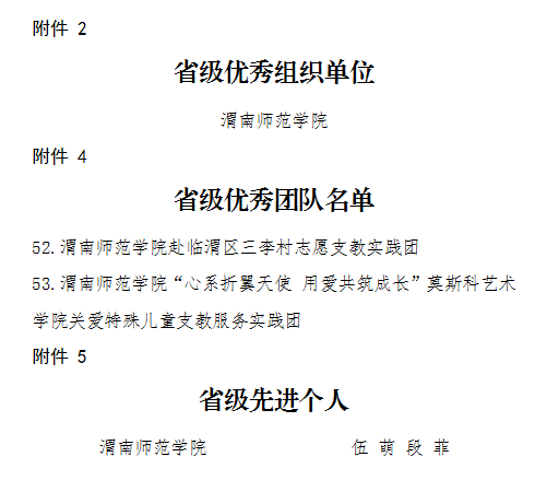 bat365官网赴临渭区三李村志愿支教实践团、“心系折翼天使用爱共筑成长”关爱特殊儿童支教服务实践团荣获“省级优秀实践团队”;实践团队指导教师:外国语学院团总支书记伍萌、莫斯科艺术学院团总支书记段菲荣获“省级先进个人”。