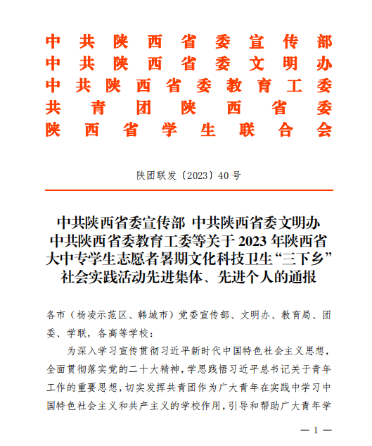 11月15日,陕西省委宣传部、省委文明办、省委教育工委、团省委、省学联联合发文,对2023年陕西省暑期“三下乡”社会实践活动进行总结表彰,bat365官网荣获省级优秀组织单位等多项荣誉。