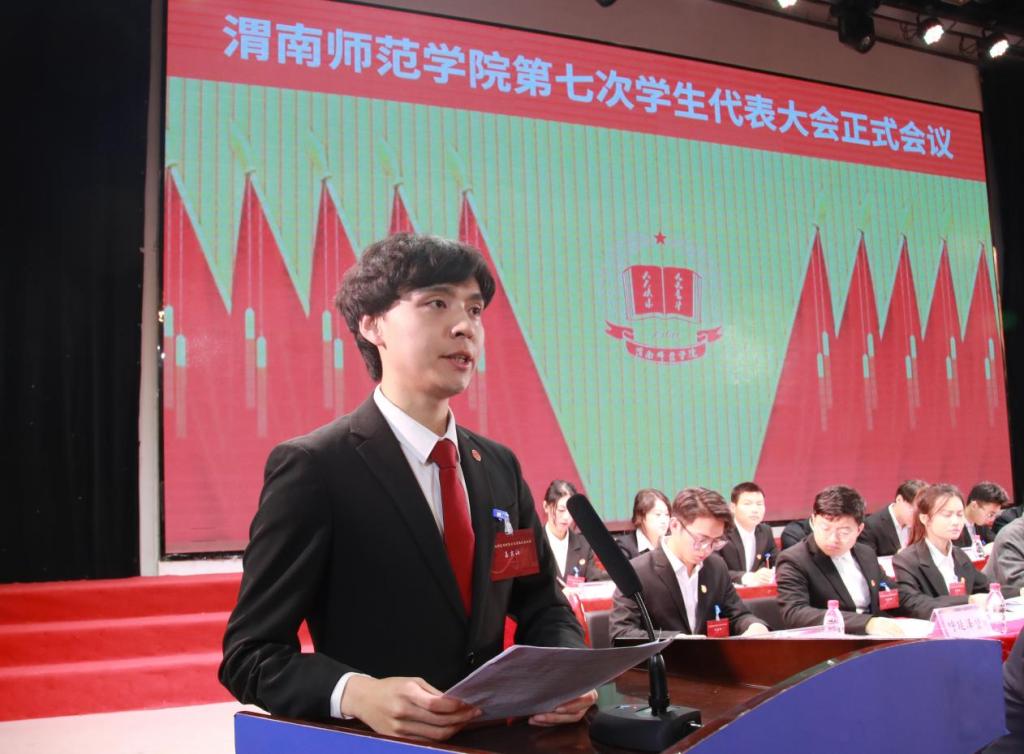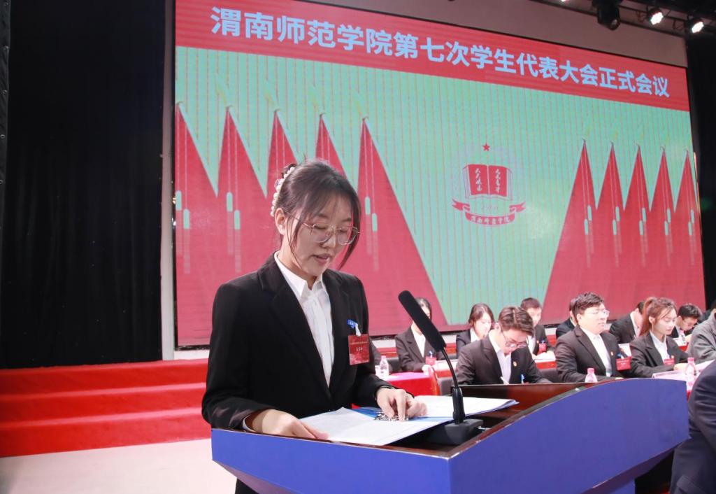 bat365官网学生会主席团成员徐婷婷代表第六届学生委员会向大会作题为《不忘初心行志远,不负岁月勇作为,在建设特色鲜明的高水平地方特色师范大学征程中贡献青春力量》的工作报告。