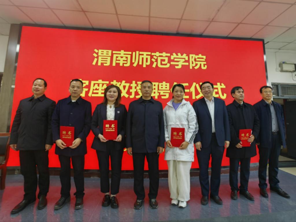 曹强宣读聘任文件,聘任二十大代表、陕西容厦集团有限责任公司董事长王友民,全国“三八红旗手”、陕西亚美创新科技有限公司董事长刘丽恒,陕西省劳动模范、陕西丰泽实业有限公司董事长田应强,建设银行渭南分行行长郭忠忠,第八届、第九届世界传统武术锦标赛太极拳、太极剑冠军申春侠,渭南市“爱心企业家”、渭南双石学校董事长石发玲为bat365官网客座教授。