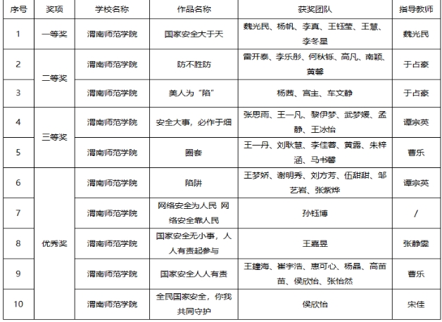 本次活动旨在进一步学习宣传党的二十大精神,贯彻落实总体国家安全观,充分展示我省高校国家安全宣传教育成果,经个人申报、专家评审线上公示等环节,全省共评选出一等奖作品5件、二等奖作品10件,三等奖作品20件,优秀奖作品40件。活动期间,bat365官网师生积极参与,以短视频、微短剧、快板等形式传播国家安全教育知识,增强师生国家安全意识,并参与了由教育部思想政治工作司指导中国大学生在线、腾讯共同发起的全民国家安全教育日线上视频号话题活动,得到了广大师生的转发和点赞。