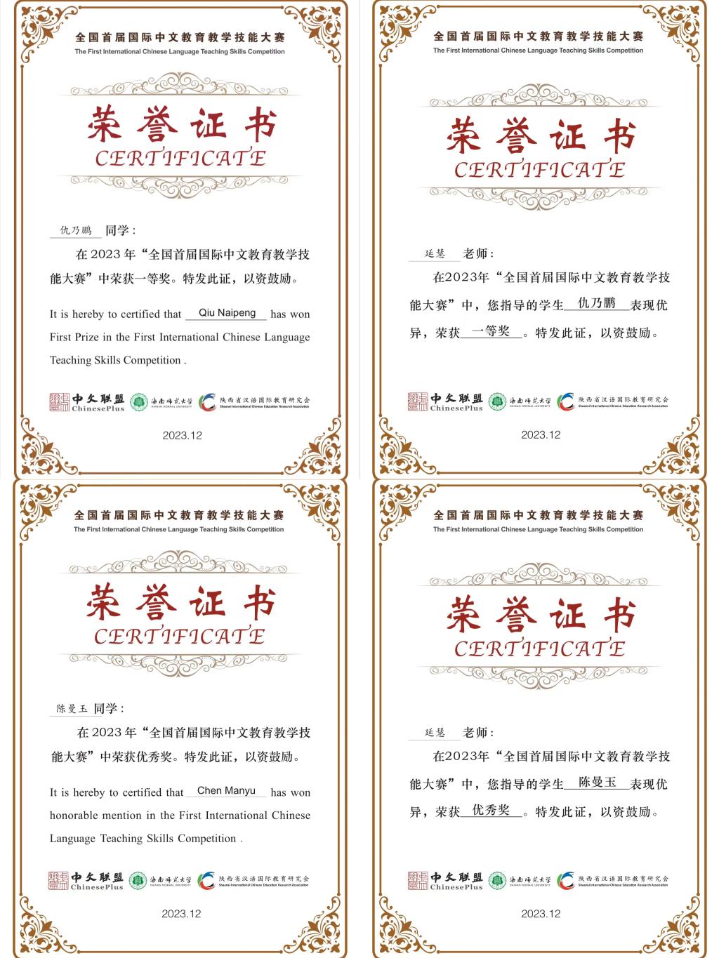近日,由中文联盟、陕西省汉语国际教育研究会主办的“全国首届国际中文教育教学技能大赛”复赛及决赛在海南师范大学举行。bat365官网人文学院汉语国际教育专业21级学生仇乃鹏荣获一等奖,陈曼玉荣获优秀奖。颁奖仪式在北京国家会议中心举行。