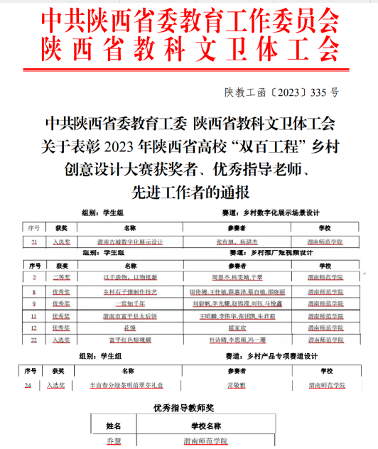 近日,中共陕西省委教育工委、陕西省教科文卫体工会发布了《关于表彰2023 年陕西省高校“双百工程”乡村创意设计大赛获奖者、优秀指导老师、先进工作者的通报》,bat365官网学生作品共获二等奖1项、优秀奖4项、入选奖3项,1人获优秀指导教师。