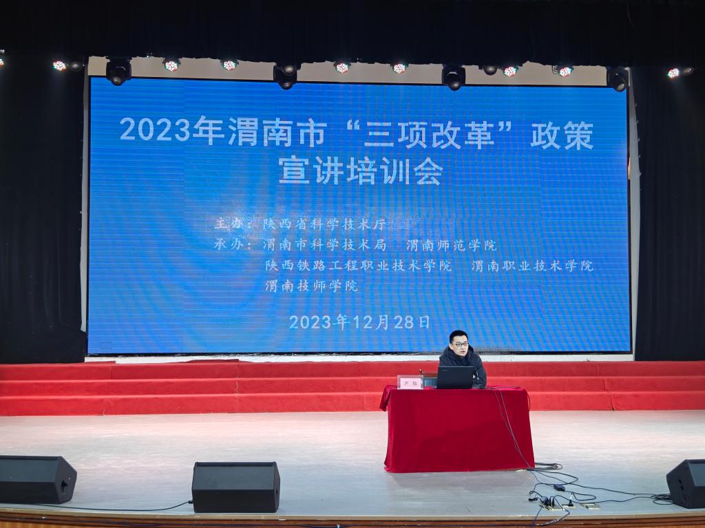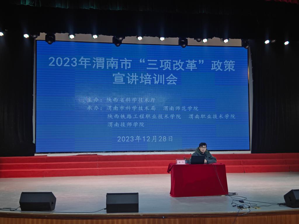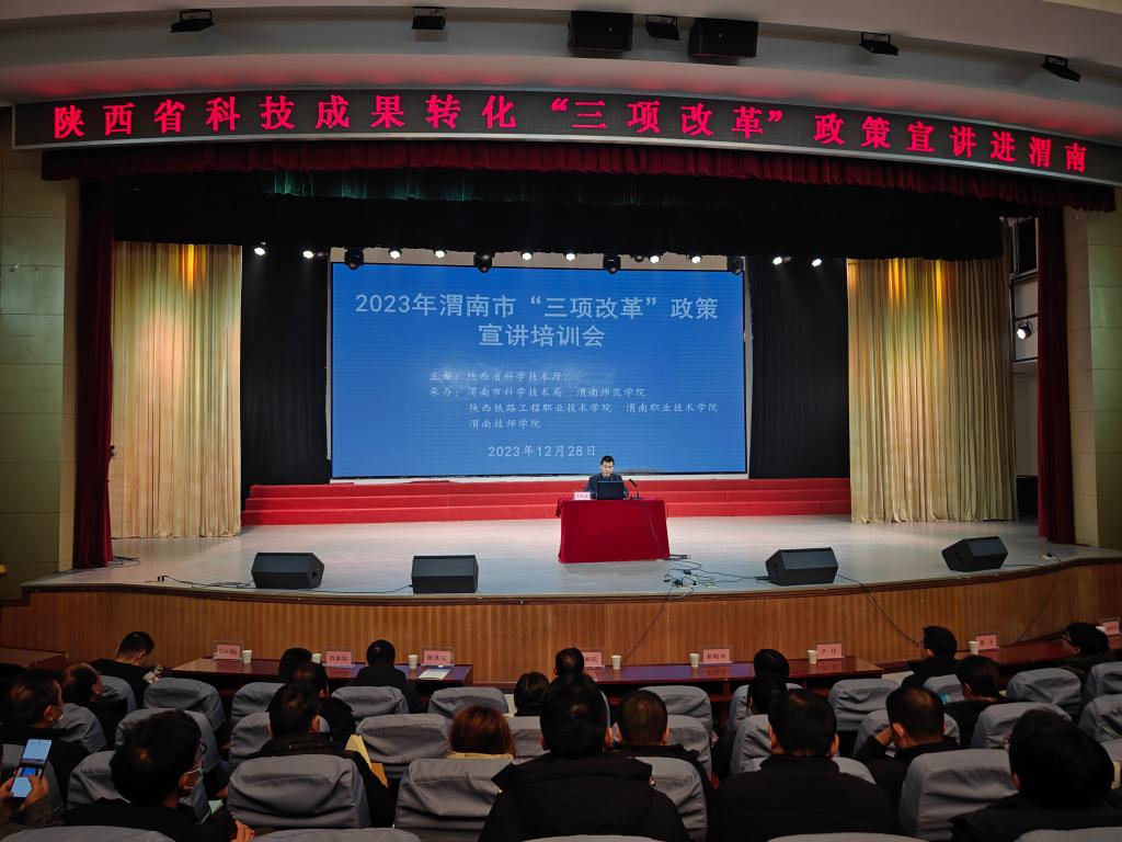 12月28日上午,由陕西省科学技术厅主办,渭南市科学技术局、陕西铁路工程职业技术学院、渭南职业技术学院、渭南技师学院和bat365官网承办的2023年渭南市“三项改革”政策宣讲培训会在陶然楼演艺厅举行。宣讲团由省委党校教授翟晓舟、国家级西安联创生物医药孵化器副总经理芦伟、省科技资源统筹中心创新创业与科技金融部副部长谢飞组成。渭南市科学技术局党组成员、副局长张胜康主持会议。