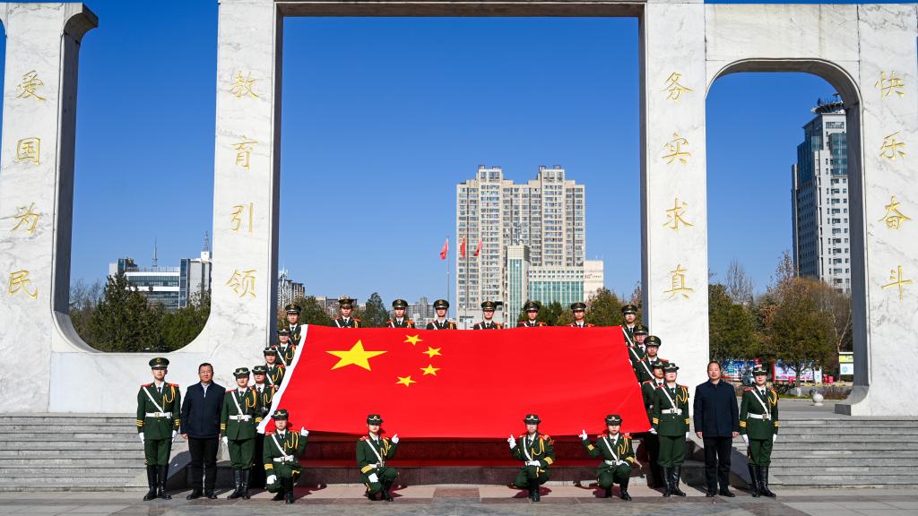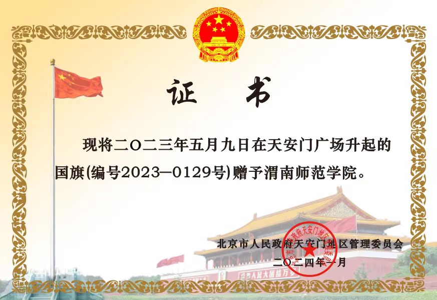 获赠学校63周年校庆日在北京天安门广场上升起的国旗,是bat365正版唯一官网全体师生和校友的集体荣耀,也是持续加强爱国主义教育的重要使命。这面珍贵的国旗将更加激发bat365官网广大师生和校友的爱国热情、爱校情怀,强化渭师人的使命担当,让爱国主义的伟大旗帜始终在bat365正版唯一官网师生心中高高飘扬!(通讯员 张静 审核人 赵琦)