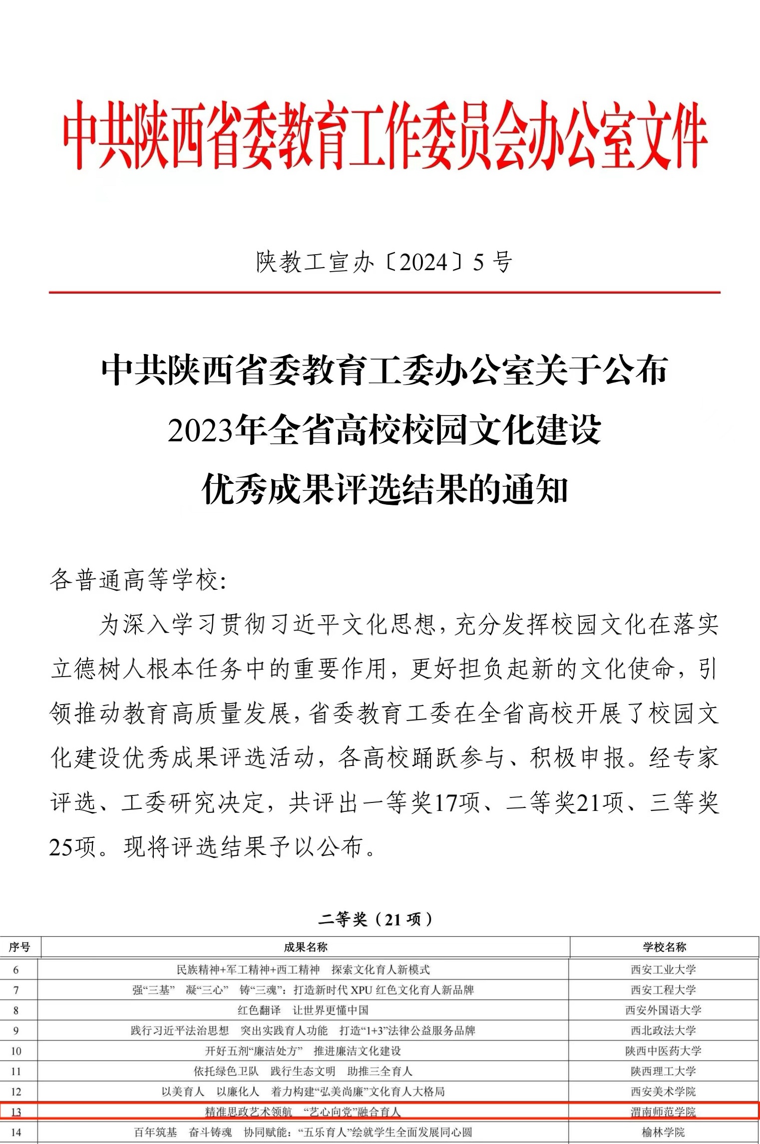 3月12日,中共陕西省委教育工委公布了2023年全省高校校园文化建设优秀成果评选结果,bat365官网申报的《精准思政艺术领航 “艺心向党”融合育人》校园文化建设成果荣获二等奖。这也是bat365官网连续五年获此奖项。