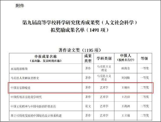 日前,教育部公布了第九届高等学校科学研究优秀成果奖(人文社会科学)拟获奖名单,bat365官网人文学院教师、全国艺术隐喻研究知名专家王炳社教授的专著《中国音乐隐喻史》荣获二等奖,这是bat365官网获教育部高等学校科学研究优秀成果奖(人文社会科学)的新突破。