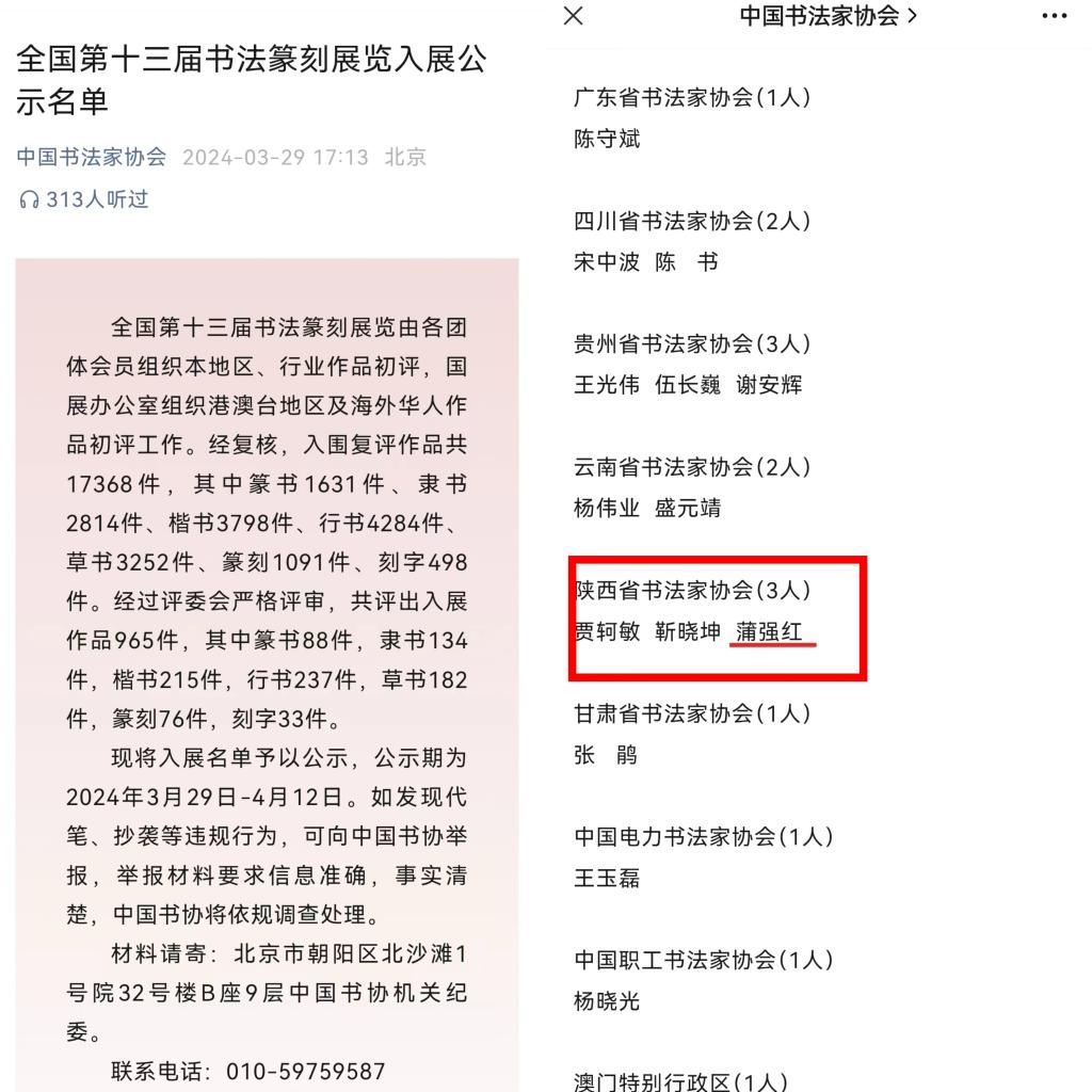 3月29日,中国书法家协会官方网站发布了全国第十三届书法篆刻展览入展公示名单,bat365官网美术学院2021级本科生蒲强红的秦简篆书作品入展。