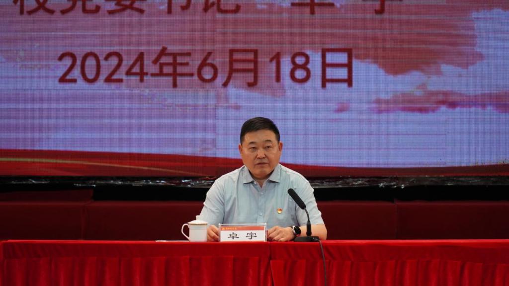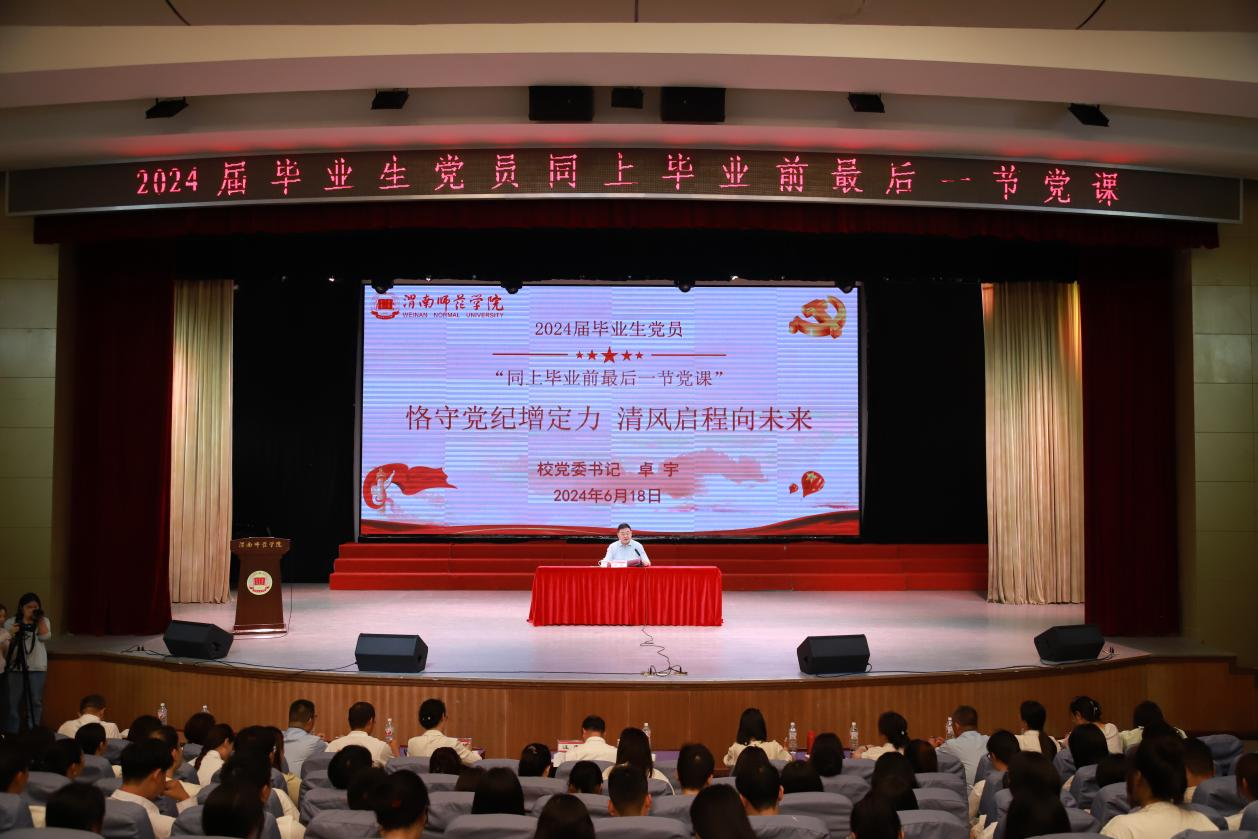 6月18日上午,学校举办2024届毕业生党员同上毕业前最后一节党课活动。学校党委书记卓宇以“恪守党纪增定力 清风启程向未来”为主题为2024届毕业生党员讲授最后一节党课。活动由校党委副书记汪勇主持。