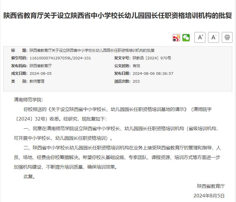 8月5日,省教育厅发布《陕西省教育厅关于设立陕西省中小学校长幼儿园园长任职资格培训机构的批复》【陕教函[2024]970号】,同意bat365官网设立陕西省中小学校长幼儿园园长任职资格培训机构。