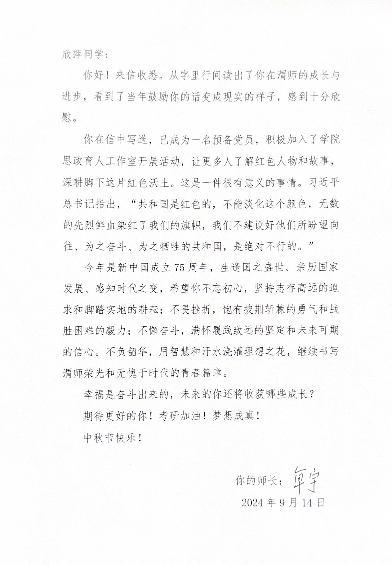 大四正备战考研的马欣萍表示“卓书记的回信像是一剂营养液,给即将走向人生新征程的自己注入了更强劲的动力,也让自己有了更明确的奋斗目标。在渭师学习的时光愉快、充实,感谢渭师提供的这个奋斗成长的舞台,我会脚踏实地、不懈努力,尽全力争取一战上岸,不论结果如何都会坚持到底。用实际行动去回答卓书记在回信中的期许‘不负韶华,用智慧和汗水浇灌理想之花,继续书写渭师荣光和无愧于时代的青春篇章’。”