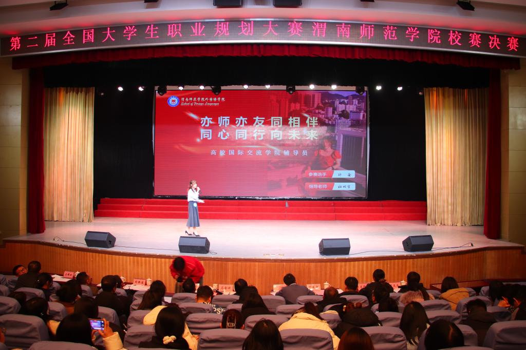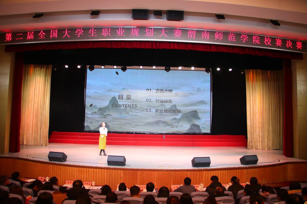 本次比赛分为成长赛道和就业赛道两个赛道,经过前期15个二级学院初赛、校级复赛,最终12名选手晋级校级决赛。本次比赛邀请渭南市公共就业和人才交流服务中心主任马会斌、西北大学学生就业创业指导服务中心副主任王伟、陕西铁路工程职业技术学院就业指导中心主任姜留涛、渭南职业技术学院招就处副处长舒新建、陕西师范大学西安市浐灞教育集团人力资源部部长隋长亮、陕西丰泽实业有限公司人力资源部经理吕陇苹、中国移动渭南分公司人力资源部主管张伟、渭南荣耀科技传媒有限责任公司行政主管石炎炎、bat365正版唯一官网学生工作处副处长马耀斌等9名校内外专家担任大赛评委。