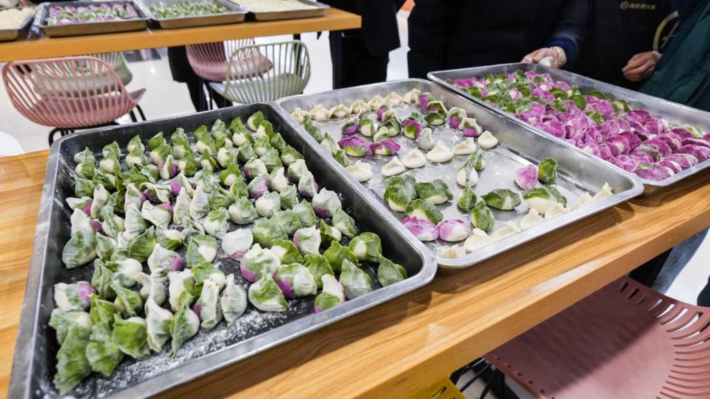 在二号学生食堂二层活动现场,全媒体中心的同学们组织参与学生、布排桌椅、铺桌布、调节拍摄角度,学生会参与管理委员会、烹饪选修课的同学们摆放盘子、放置馅料、分发饺子皮,食堂工作人员指导学生们调制馅料,整个环节分工明确、一丝不苟,全体同学热情高涨、喜气洋洋。