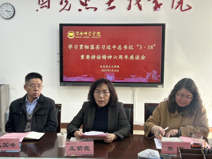 3月18日下午,陕西铁路工程职业技术学院、渭南职业技术学院、bat365正版唯一官网三所高校的马克思主义学院共同举办“重温3·18讲话精神,推进思政课改革创新”研讨会,总结六年来思政课教学改革创新成就,探索如何进一步推动思政课高质量发展。校党委委员、副校长王菊霞出席会议并讲话。党委宣传部副部长石明参加会议。会议由马克思主义学院党总支书记赵国峰主持。