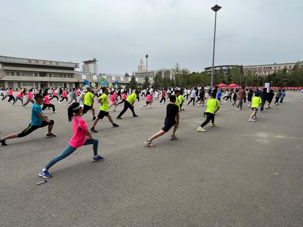 体育学院教师王敏婷领操,参赛选手做跑前热身操