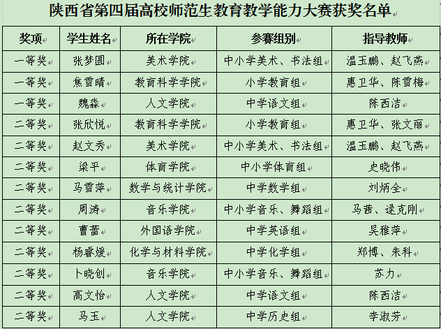 近日,陕西省第四届高校师范生教育教学能力大赛决赛成绩揭晓,bat365官网共有13名师范生参加了语文、数学、英语、历史、化学、小学教育、美术书法、音乐舞蹈、体育等9个学科的省级决赛,最终获得一等奖3项、二等奖10项。