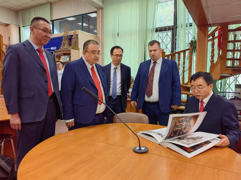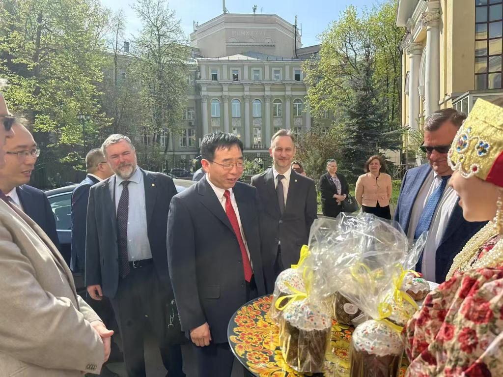 在莫斯科国立师范大学,该校师生按照当地迎接最尊贵客人“面包和盐”的传统礼节,举行了隆重的欢迎仪式,校长卢布科夫引导代表团参观了主楼并讲解。