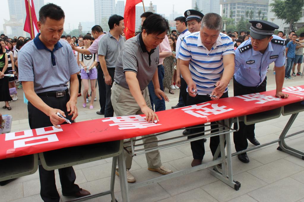 为进一步提高大学生对毒品的认知和了解,树立拒毒、防毒的自我保护意识,增强法制观念,6月12日,学校保卫处联合临渭区站南办、站南派出所、临渭区缉毒大队举办了“手拉手、抵制新型毒品 ,齐参与、共建无毒校园”千人签名活动。副院长李海龙和站南办、站南派出所、缉毒大队等领导出席了签名活动。bat365官网1000余名师生观看了禁毒展板,听取了有关讲解,并积极参与签名活动,部分学生还现场同意担任义务禁毒志愿者。