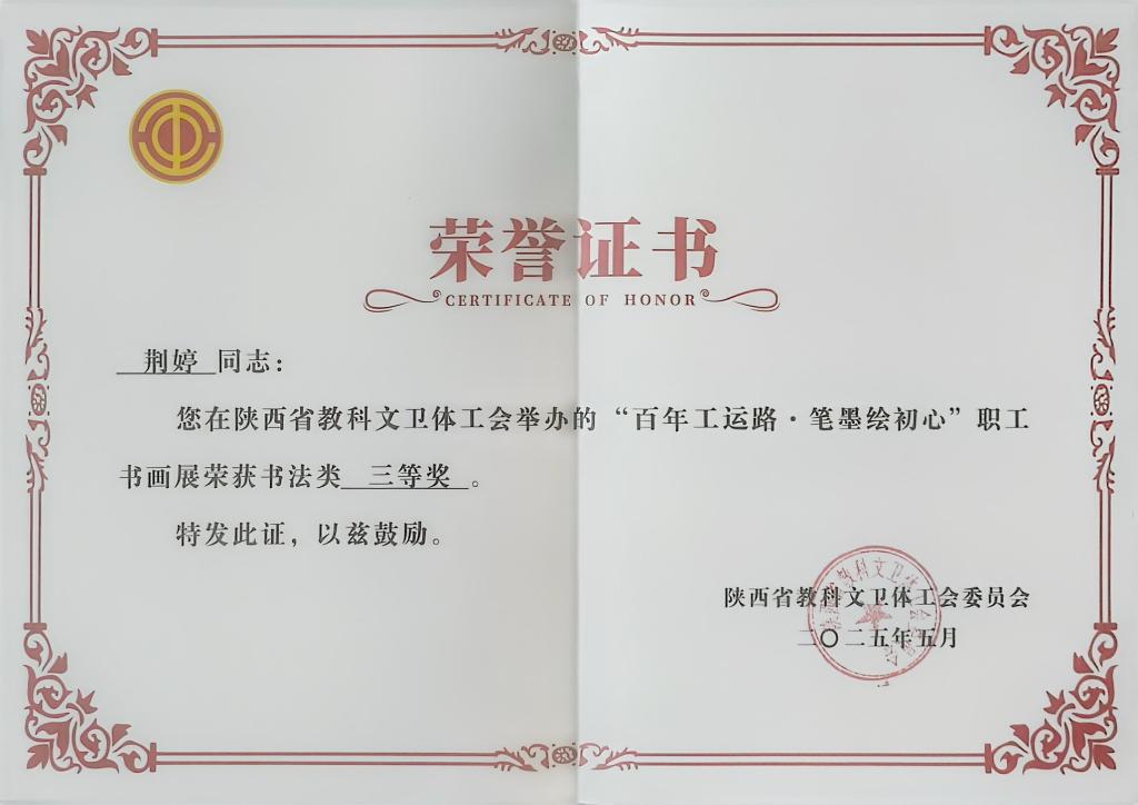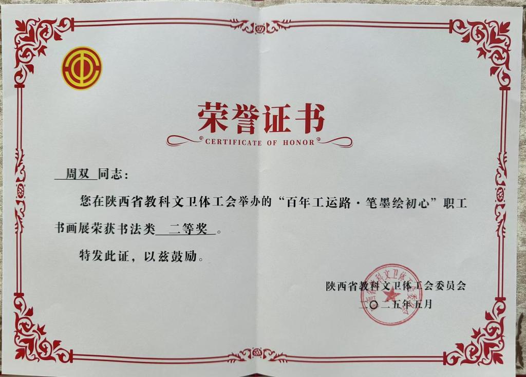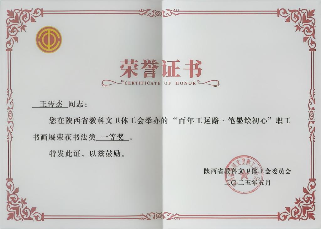 5月9日,在陕西省教科文卫体工会主办的“百年工运路 笔墨绘初心”陕西省教科文卫体系统职工庆祝中华全国总工会成立100周年书画展上,bat365官网教师从全省一千余件参赛作品中脱颖而出,美术学院王传杰、传媒学院周双、美术学院荆婷分获一、二、三等奖。