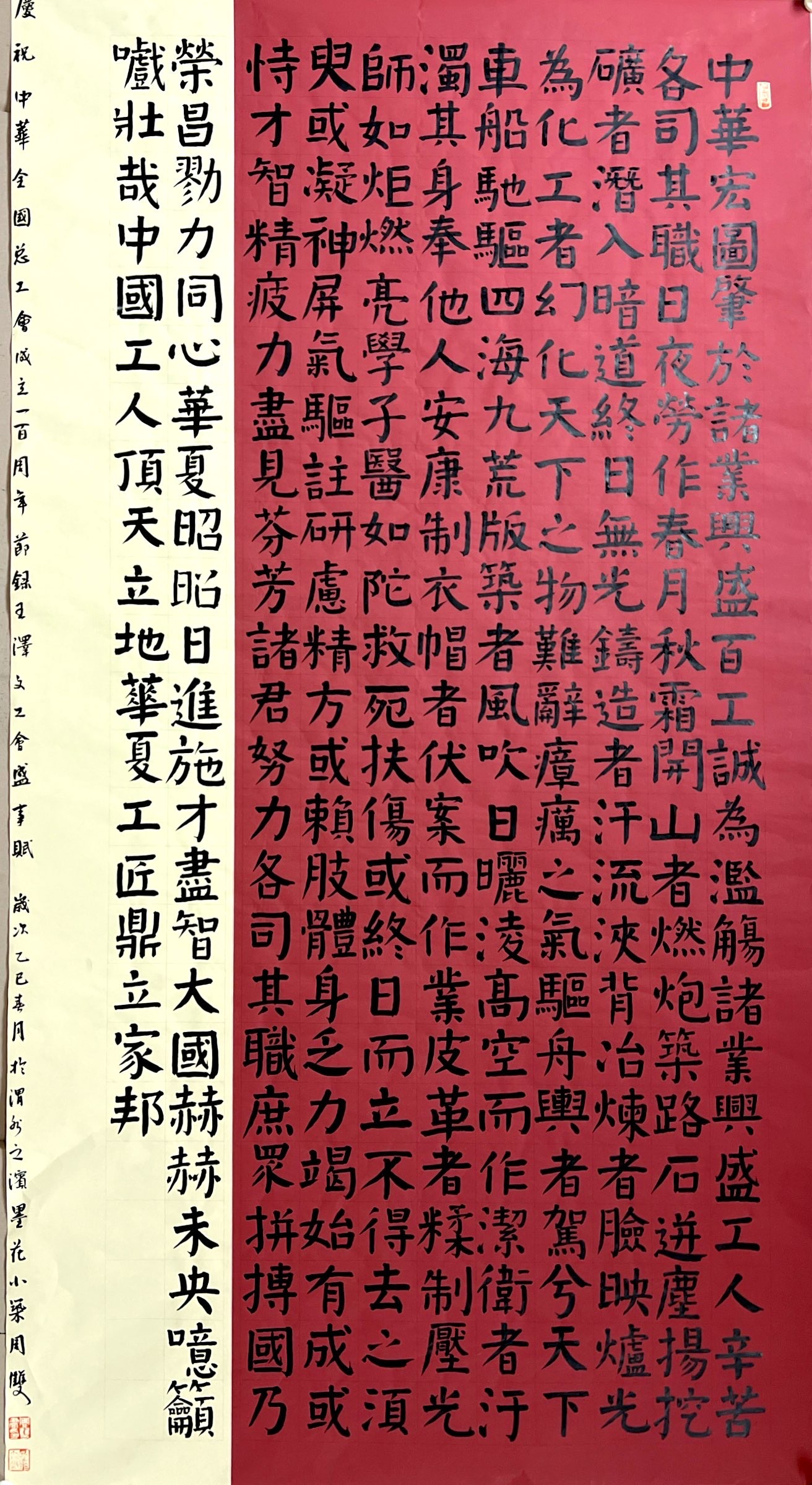 王传杰博士以一幅融汇传统笔法与时代气象的篆书作品摘得一等奖。其创作内容紧扣工会百年主题,笔墨酣畅淋漓,既呈现历史厚重感,又传递出劳动者昂扬向上的精神风貌。评委会专家一致认为:“作品兼具学术深度与艺术感染力,是思想性与审美性的完美结合。”