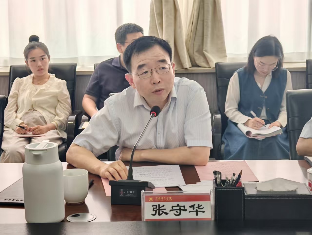 张守华以中央八项规定精神的历史脉络与新时代内涵为切入点,结合高校干部成长规律与学校事业发展实际,从五个自觉对年轻干部指明方向,一是要强化理论武装,自觉做党的创新理论的笃信笃行者;二是要锤炼政治能力,自觉做对党忠诚老实的模范践行者;三是要厚植为民情怀,自觉做矢志为民造福的无私奉献者;四是要提升履职能力,自觉做勇于担当作为的不懈奋斗者;五是要践行廉洁自律,自觉做良好政治生态的有力促进者。他强调,当前学校正处在爬坡过坎、滚石上山的关键时期,面临着申硕攻坚、审核评估、机构改革、新区建设、数字赋能等“五场硬仗”,对学校每一位干部,尤其是年轻干部的能力和素质提出了更高的要求。全校党员领导干部要坚持以习近平新时代中国特色社会主义思想为指导,深入贯彻中央八项规定精神,自觉肩负起时代赋予的光荣使命,回答好“教育强国、渭师何为、渭师人何为”的时代命题,知责担责、知重负重,锐意改革、勇于创新,扎根渭南、深耕教育,为培养新时代“大国良师”、建设师范特色鲜明的一流渭师贡献应有的力量。