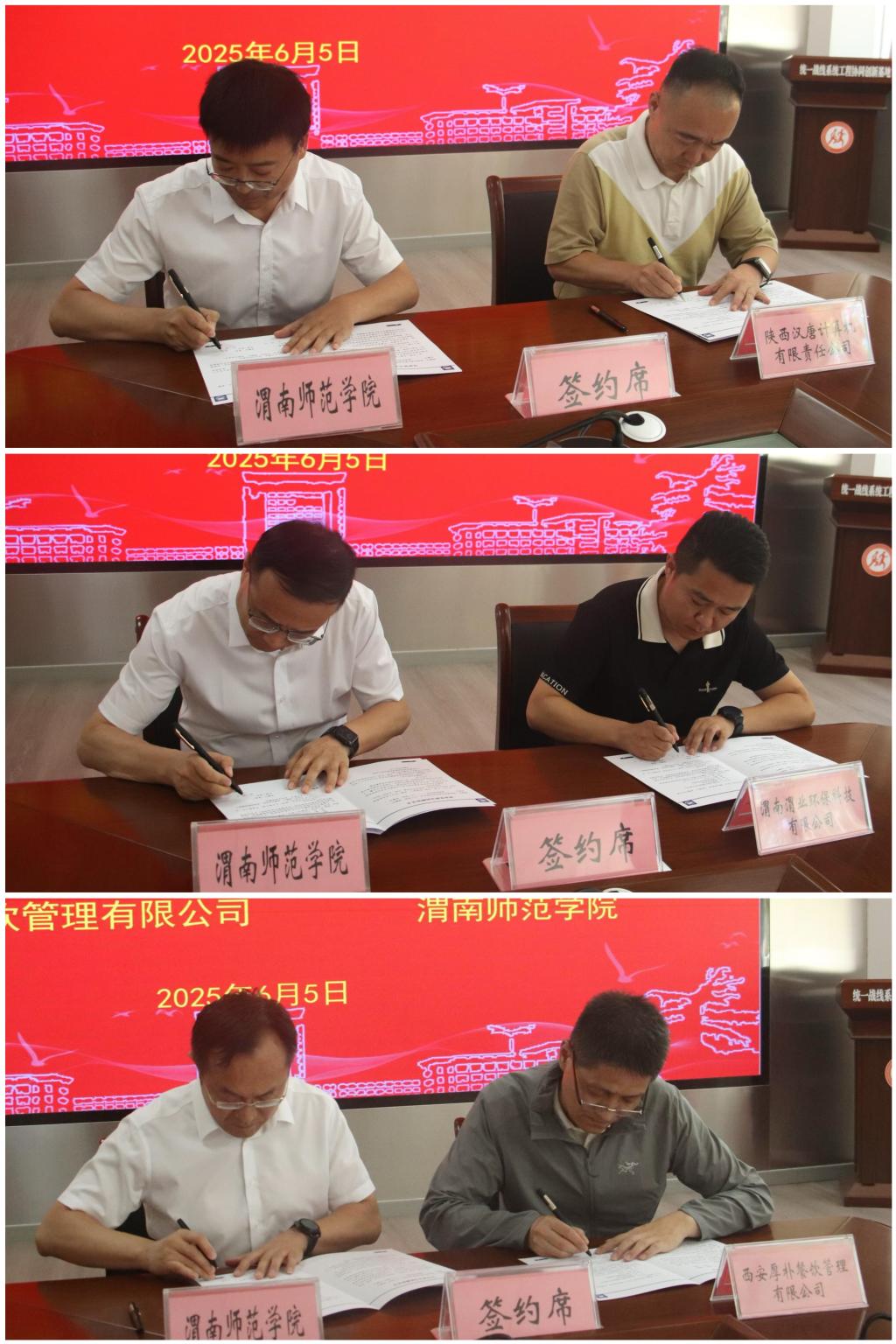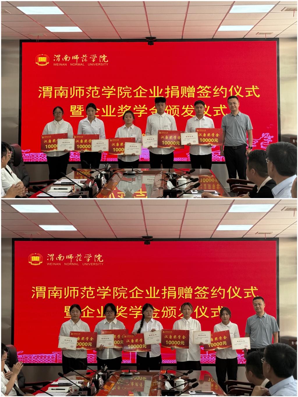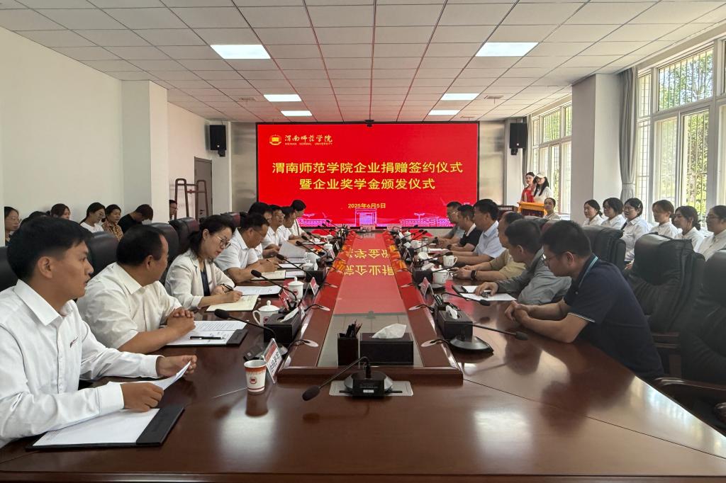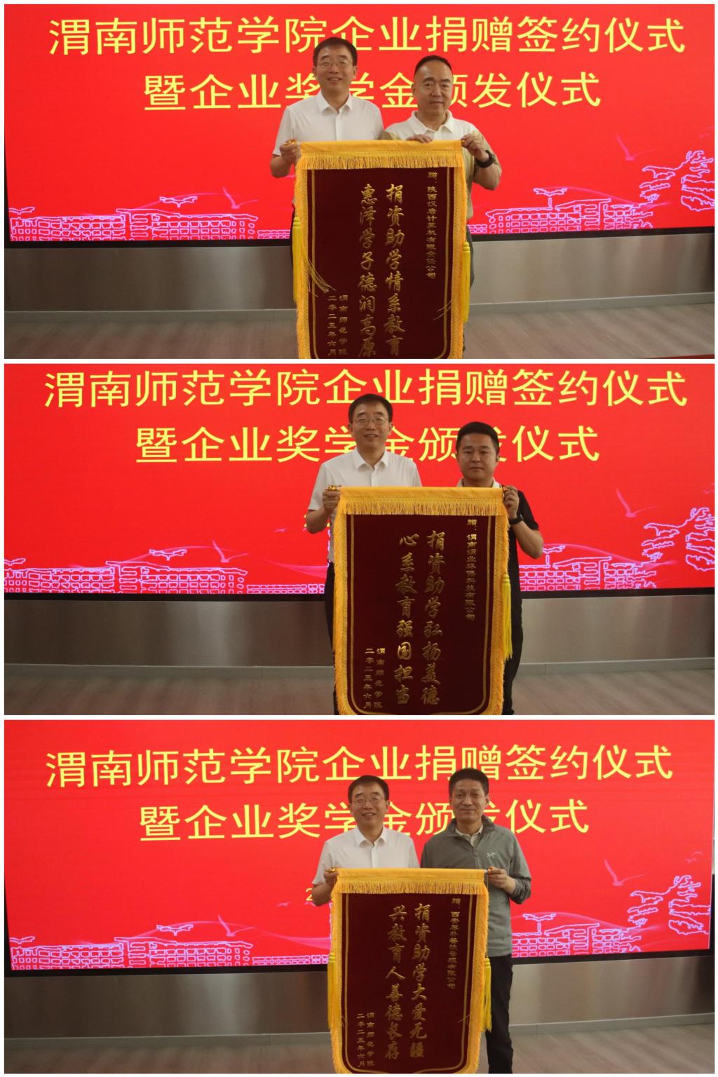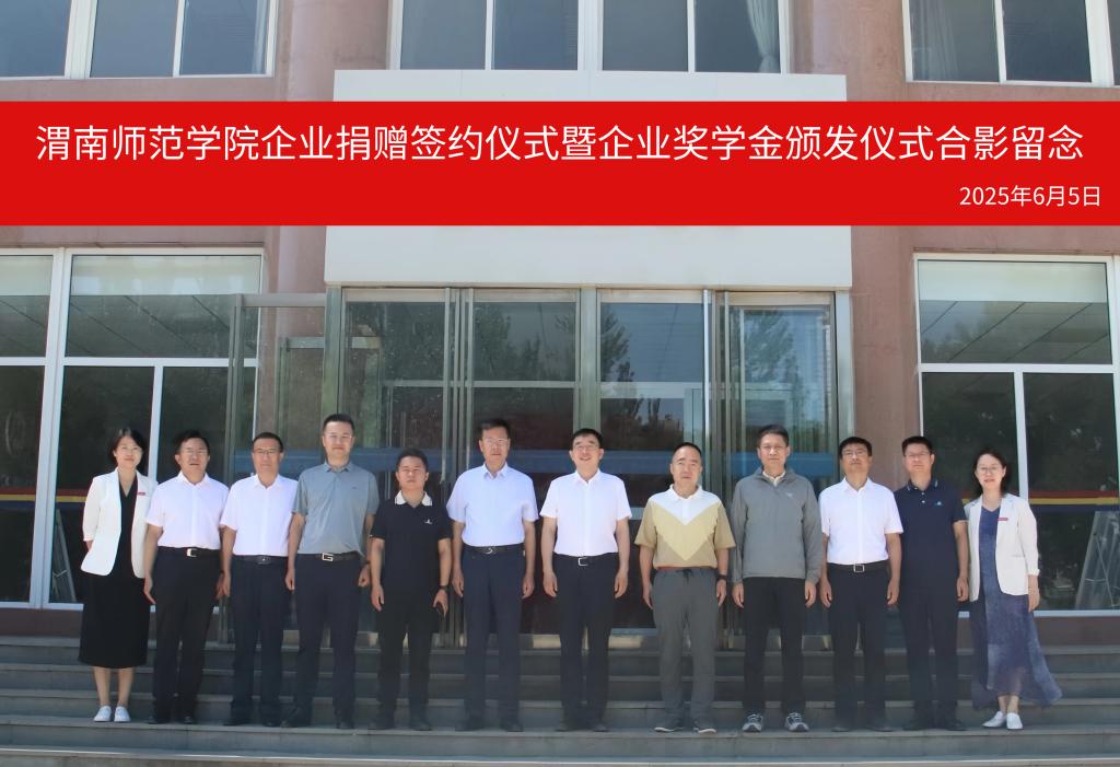 6月5日上午,学校举行企业捐赠签约仪式暨企业奖学金颁发仪式。学校党委书记张守华,渭南市教育局党组成员、副局长姜小卫,陕西汉唐计算机有限责任公司董事长杨建新,渭南渭业环保科技有限公司总经理赵林渭,西安厚朴餐饮管理有限公司董事长金有民,陕西汉唐计算机有限责任公司副总经理杨军,bat365官网副校长曹强、王海峰出席仪式。仪式由学校党委副书记常青林主持。