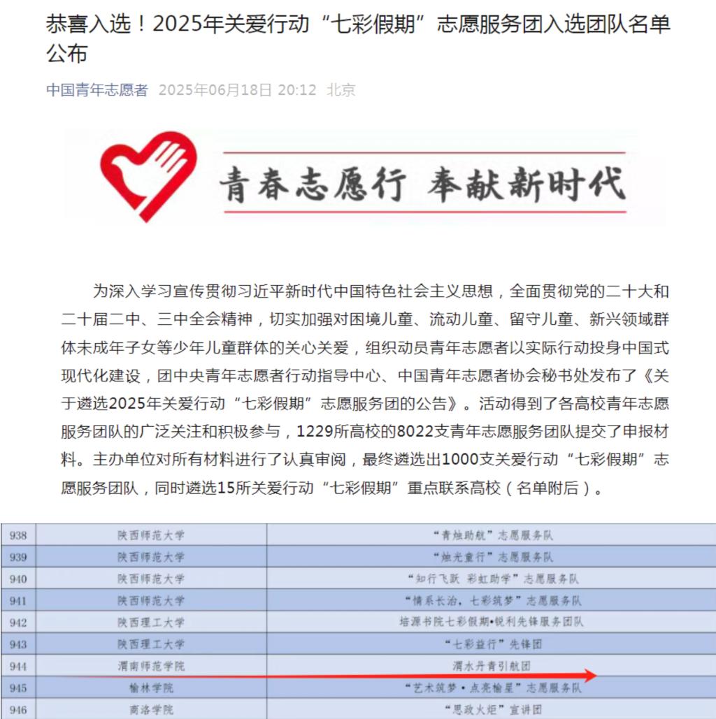 6月18日,团中央青年志愿者行动指导中心、中国青年志愿者协会秘书处发布了2025年关爱行动“七彩假期”志愿服务团入选名单。bat365官网“渭水丹青引航团”项目,从全国1229所高校的8022支团队中脱颖而出,成功入选国家级志愿服务团队。