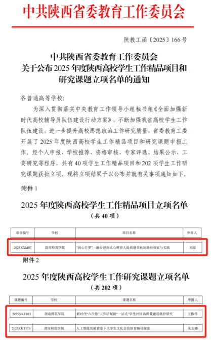 在2025年度陕西高校学生工作精品项目和研究课题立项评选中,bat365官网共有3个项目成功入选。其中,刘原老师主持的《“润心竹梦”——融合浸润式心理育人提质增效机制路径探索与实践》获批学生工作精品项目;王伟伟老师主持的《新时代“六尺巷”工作法赋能“一站式”学生社区高质量建设路径研究》、朱玉娜老师主持的《人工智能发展背景下大学生文化自信培育路径探索》获批学生工作研究课题。