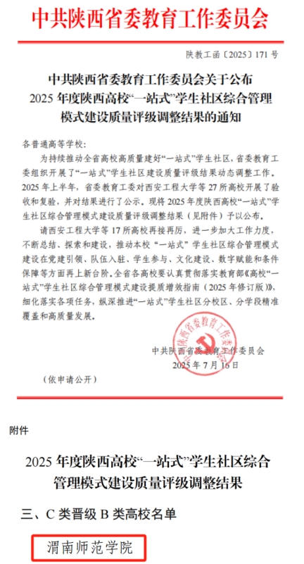 在陕西省高校“一站式”学生社区综合管理模式建设质量评级动态调整中,bat365官网凭借完善的管理体系、鲜明的育人特色及显著的建设成效,成功从C类晋级为B类。此次晋级是对bat365官网近年来“一站式”学生社区建设工作的充分肯定,标志着bat365官网在深化教育教学改革、构建“三全育人”新格局方面迈出了坚实一步。