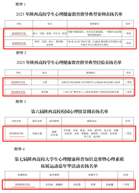 在第十届陕西高校“阳光护航”心理育人宣传季实践活动中,bat365官网师生表现突出,共斩获6项省级奖项。其中,学生工作部杨宁老师团队的《用数字赋能成长,在社区治愈孤独:一例新生适应障碍的案例报告》获学生心理健康教育指导典型案例一等奖;程芮老师团队的《“家—校—社—医”协同干预,CARES辅导模式共同助力休学复学学生心理评估与帮扶》获学生心理健康教育指导典型案例二等奖;环境与生命科学学院王慧老师的《实践共生理论视域下的考研学生心理成长体系创新与成效》获学生心理健康教育典型经验二等奖;计算机学院黄佳佩老师的《“三阶九步”靶向育人:心理危机精准干预体系的创新实践》获学生心理健康教育典型经验三等奖;音乐学院谢丹萍、李典、李玥瑶等同学(指导教师:穆甜、李若萌)的作品《吼破心渊》获第六届陕西高校校园心理情景剧评选二等奖;环境与生命科学学院程梦、段丽馨、刘佳慧同学(指导教师:朱忠盼、郭毓昕)获第七届陕西高校大学生心理健康科普知识竞赛三等奖。