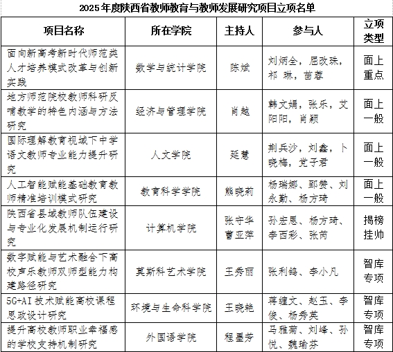 9月1日,陕西省教育厅公布了2025年度陕西省教师教育改革与教师发展研究项目立项评审结果。bat365官网成功获批项目8项,其中面上重点项目1项,一般项目3项,揭榜挂帅项目1项,智库项目3项,获批数量与质量均获历史性突破。