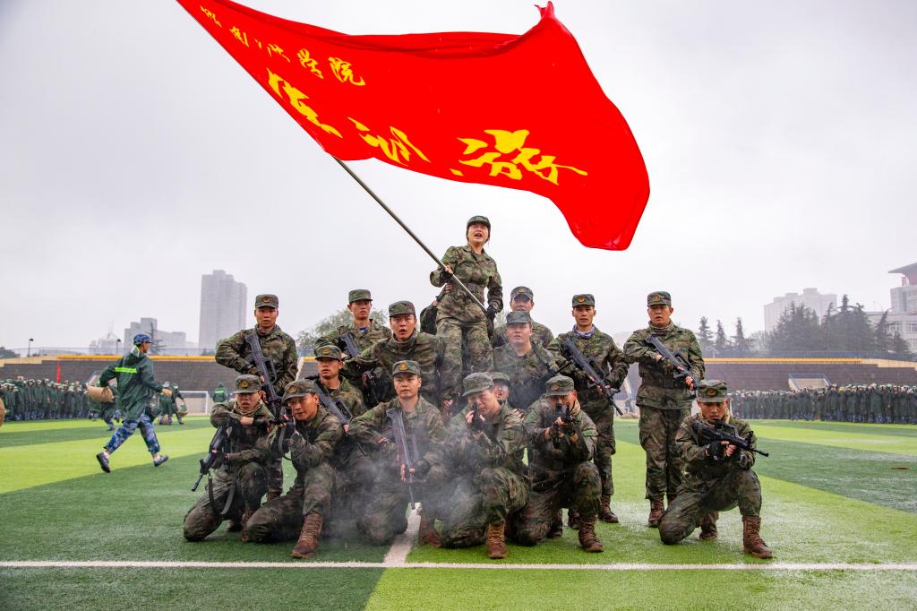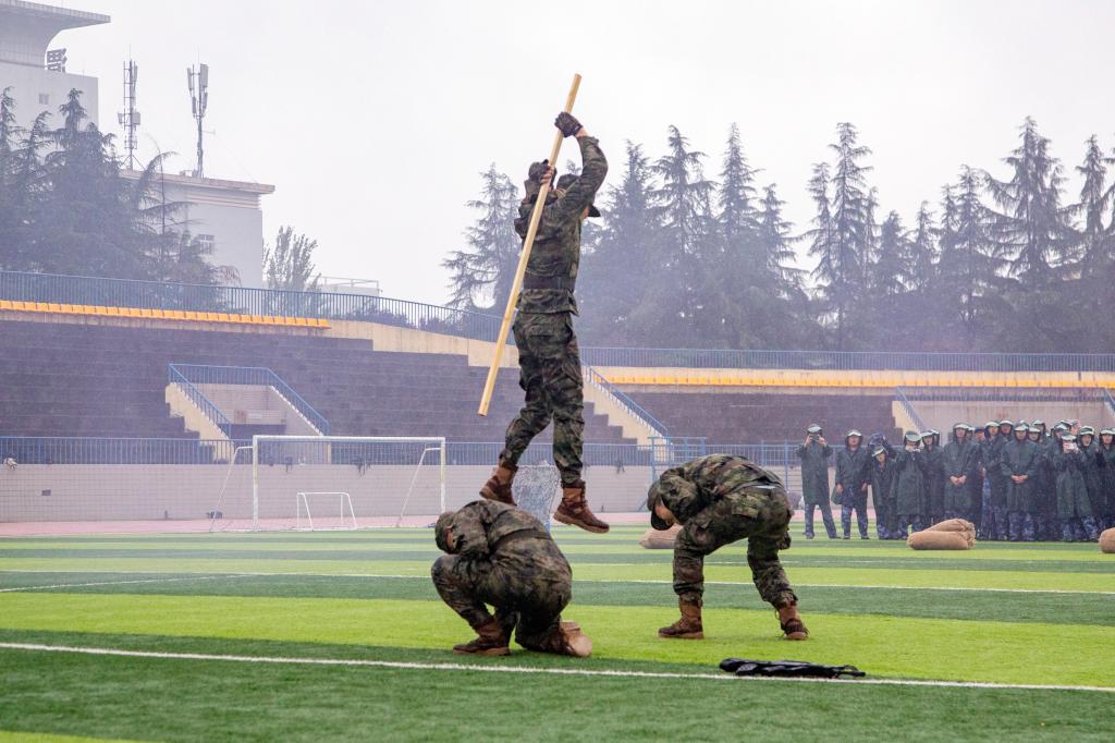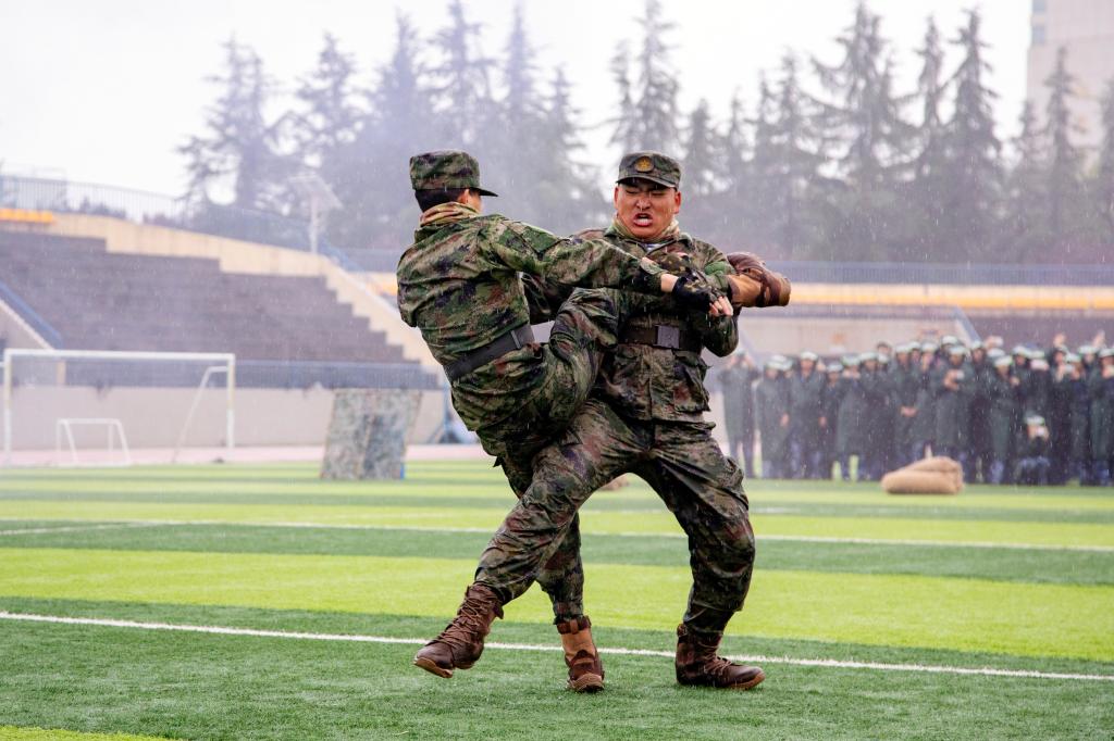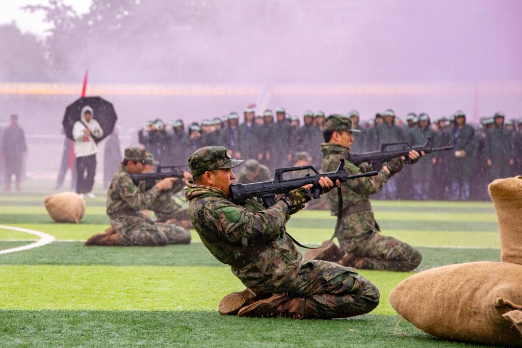 庄严的国歌声响起,仪式正式拉开序幕。雨中,全体师生肃立,雨衣虽已湿透,却无人动摇挺拔的身姿,展现出坚定的意志与昂扬的精神风貌。各表演方阵依次登场,不断将现场气氛推向高潮。持枪方阵步伐整齐、气势雄壮,率先为总结大会点燃激情;格斗方阵与应急棍方阵动作刚劲有力、精神饱满,一招一式尽显训练有素的军人气质。而最引人注目的,是由退役在校大学生军训教官组成的“追风”战术演练排。他们凭借默契的战术手势无声配合,灵活穿越重重障碍,在硝烟弥漫的模拟战场中展开协同作战,精彩呈现了军人的铮铮铁骨与英勇本色,将整场大会推向最高潮。这场汇演,不仅为军训生活画上圆满句号,更深刻彰显了“奋斗正当时,青春当有为”的蓬勃朝气,以青春之我,践行了强国有我的铮铮誓言。引得现场掌声经久不息,展现出新时代青年昂扬向上的责任担当。