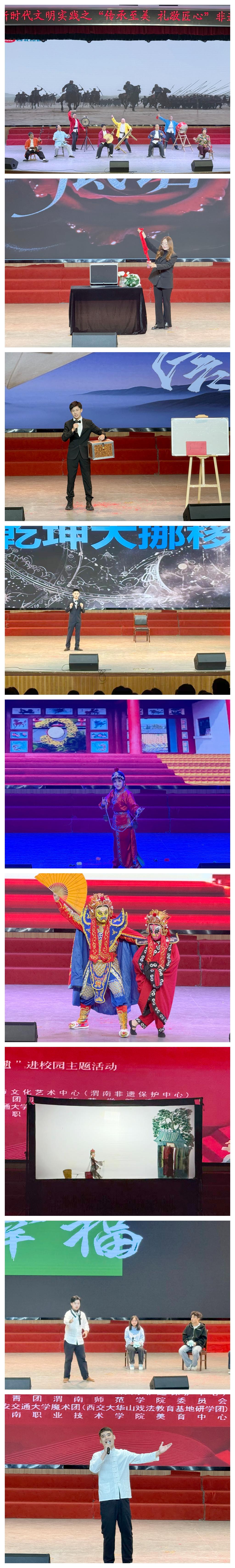 动态演出区则是一场视听盛宴,将非遗的感染力推向高潮。黄河老腔一开嗓,雄浑高亢的唱腔便裹挟着黄河奔腾的气势,瞬间点燃全场;秦腔的激越梆子、陕北民歌的婉转曲调,轮番唤醒人们对黄土文化的深情;皮影戏在白幕上演绎古今故事,光影流转间尽显传统艺术的魅力。更令人惊喜的是,变脸与魔术的创意融合、魔术相声的趣味呈现,让非遗以年轻化的表达“破圈”,赢得师生阵阵欢呼。