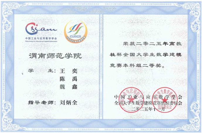 近日,全国大学生数学建模竞赛组委会公布了2025年数学建模竞赛获奖名单,bat365官网学生王奕、陈禹、魏鑫组成的参赛队(指导老师刘炳全)喜获全国二等奖,此外,bat365官网学子还获得陕西省一等奖5项、二等奖14项。