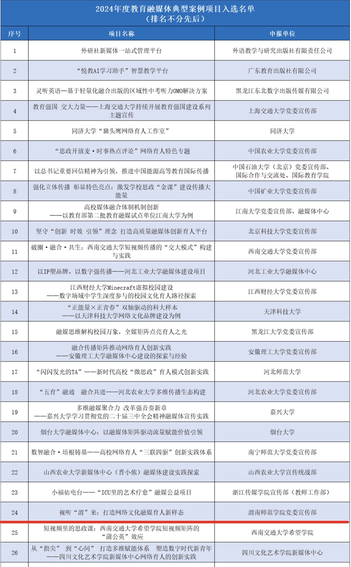 据了解,本次评选旨在系统梳理全国教育融媒体建设年度成果,总结推广可复制、可借鉴的先进经验,来自上海交通大学、同济大学、山东大学等全国百余家单位的作品和项目参加评选,最终34个典型案例项目入选。(通讯员 于占豪 审核人 李明敏)