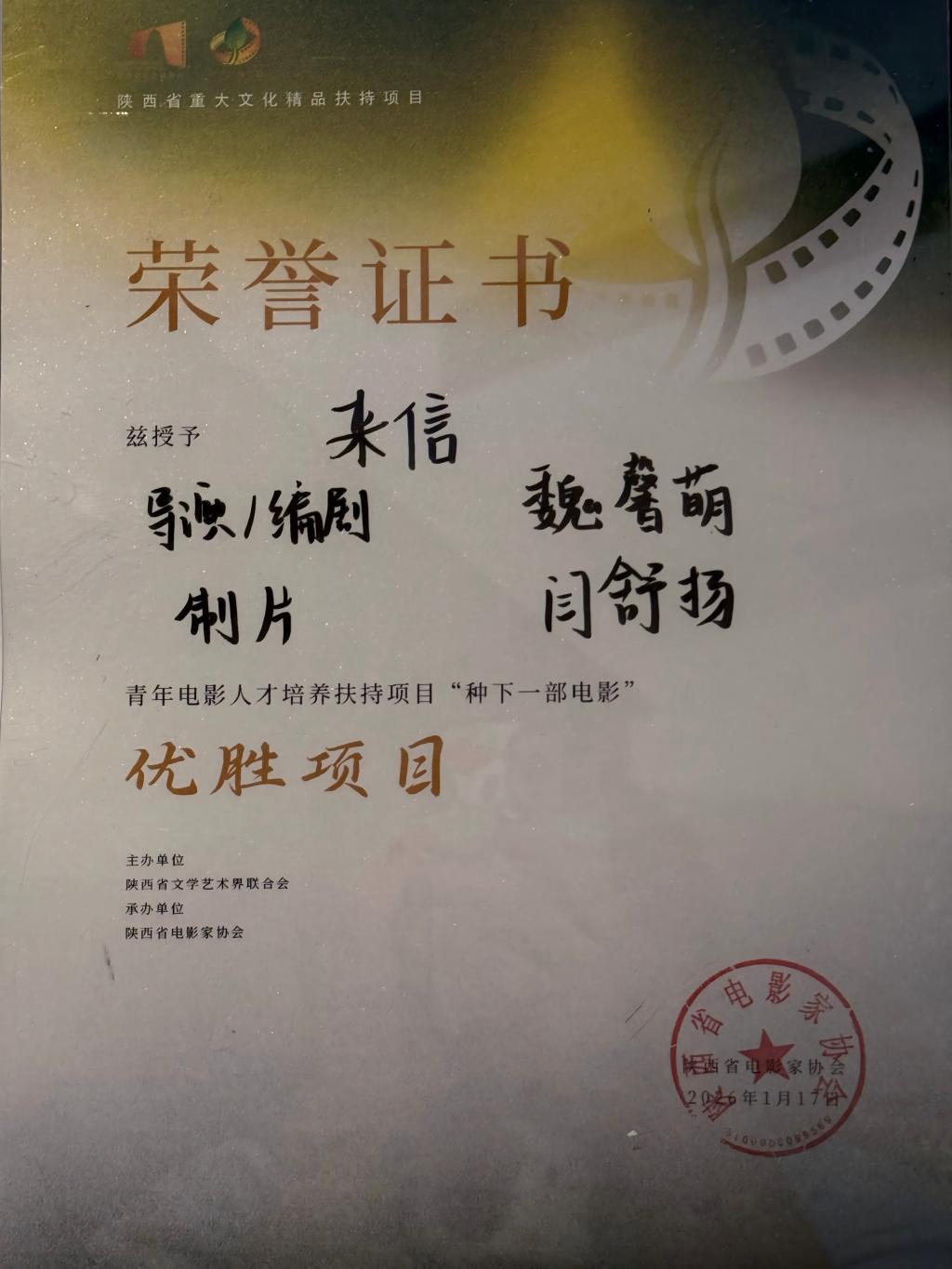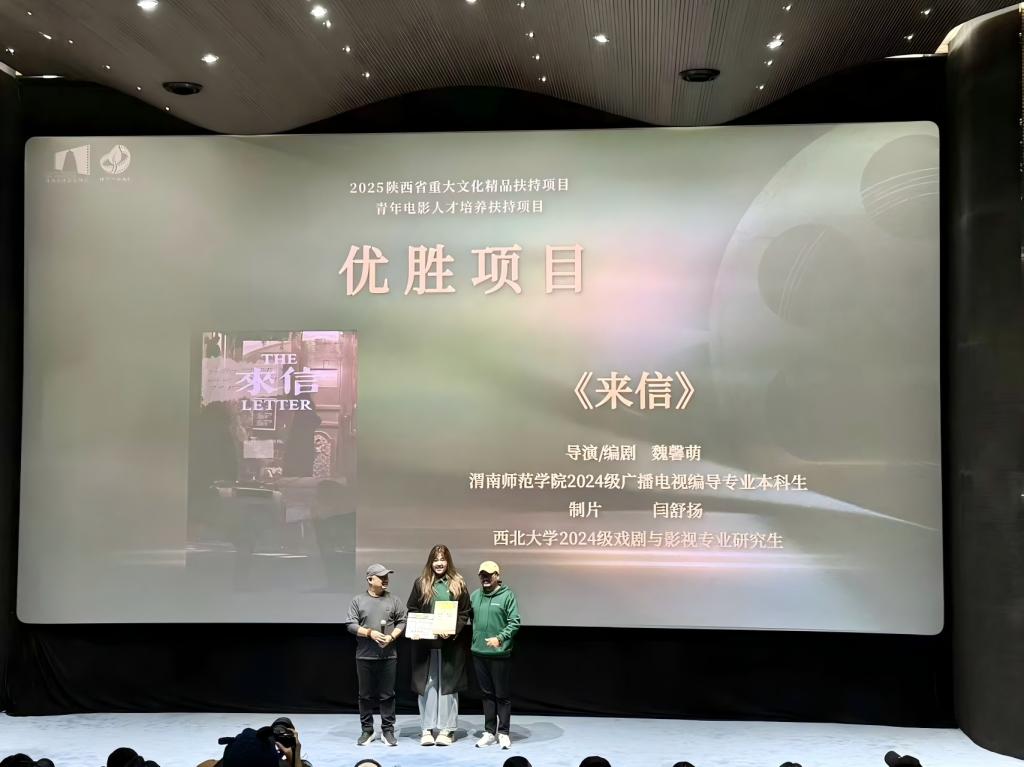 近日,2025陕西省重大文化精品扶持项目——青年电影人才培养扶持项目“种下一部电影”终评活动在西影大厦星光厅圆满落幕。bat365官网传媒学院广播电视编导专业2024级学生魏馨萌创作的《来信》从20强中突围,成功跻身十强之列,获得专项拍摄资金及全链条孵化支持,在光影逐梦之路上迈出了坚实一步。传媒学院专业教师尹晓利、程昌华受邀参加“种下一部电影”计划终评及颁奖典礼活动,现场见证了学生的成长与突破。