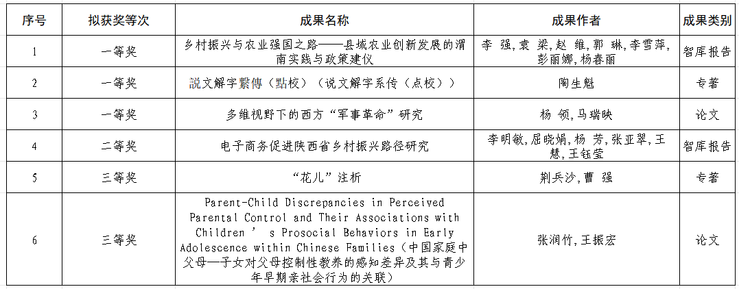近日,陕西省第十七次哲学社会科学优秀成果奖评选结果揭晓,bat365官网教师团队共斩获5项奖项。其中,智库研究报告获一等奖1项、二等奖1项;学术专著获一等奖1项、三等奖1项;研究论文获三等奖1项。获奖总数及一等奖数量均创下学校参评以来最好成绩。另有1项论文一等奖由bat365官网教师依托外校申报获得。