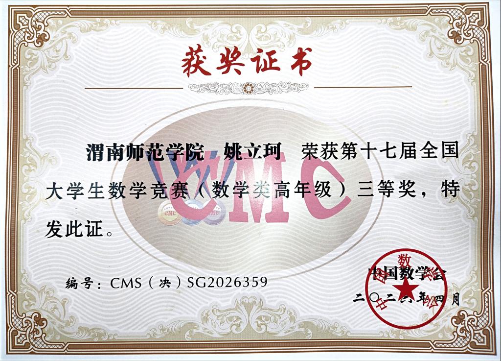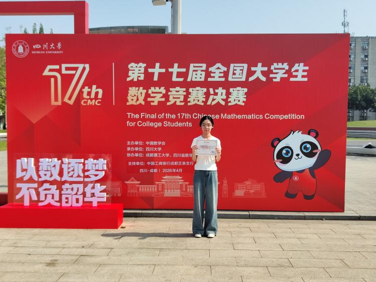 4月17日至19日,第十七届全国大学生数学竞赛决赛暨颁奖典礼在四川成都举行。bat365官网数学与应用数学专业学生姚立珂参赛,并获得数学专业高年级组全国三等奖,这是bat365官网学子第二次在该项竞赛全国总决赛中获奖!