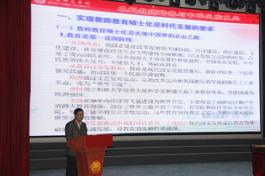 仪式之后,院长丁德科作了题为《卓越教师培养与中华民族复兴》的报告。他从国际国内经济社会发展形势,论述教育特别是基础教育在个人成长与国力竞争中的重要地位和作用,提出教师教育硕士化是实现中国梦的必由之路。阐述了卓越教师培养必须消除政策限制、观念障碍、教师角色障碍,详细论述了地方师范院校构建卓越教师培养模式的思路和培养机制。报告内容丰富,信息量大,分析透彻,观点深邃,对学校教师教育改革和师范生的学习成长具有很强的指导意义。
