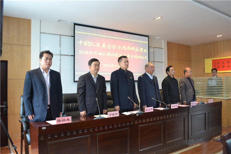 参加签字仪式的有中国孔子基金会理事长王大千、中国孔子基金会对外合作交流委员会主任杨光、中国孔子基金会传统文化教育分会副会长孙润来、渭南市政府副秘书长张黎明,学校党委书记张金安、院长丁德科、纪委书记任健、副院长李海龙、程书强、中共陕西省委党史研究室副巡视员贾巨川及学院各部门负责人、学生代表和各界知名人士。