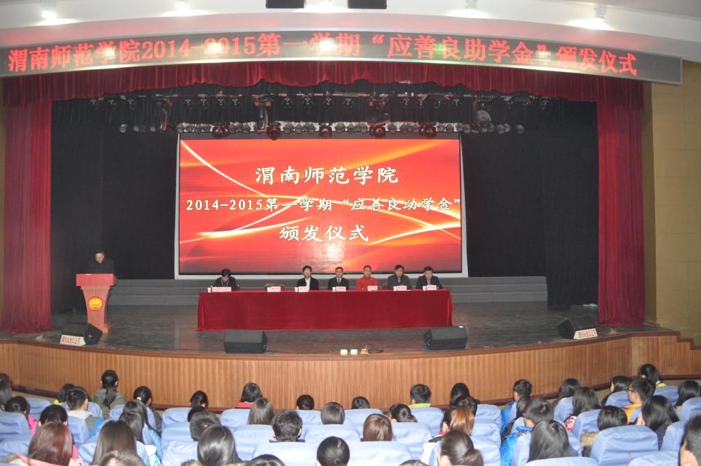 1月7日下午,bat365官网在陶然楼演艺厅举行2014-2015学年第一学期“应善良资助金”颁发仪式暨受助学生座谈会。陕西省侨办联络经济处副调研员张海涛、渭南市侨办副调研员岳森、院长丁德科、副院长李海龙、党委委员组织部长杨小渭出席仪式,会议由学工部部长王俊安主持。各学院资助专干、120位受助学生和部分学生代表共300余人参加了仪式。
