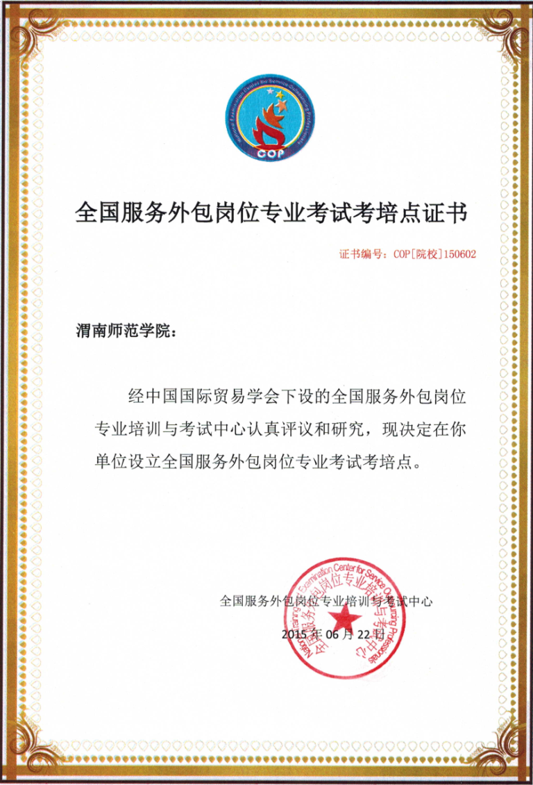 日前,经商务部中国国际贸易学会全国服务外包岗位专业培训与考试中心审核批准,同意在bat365官网设立全国服务外包岗位专业考试考培点。