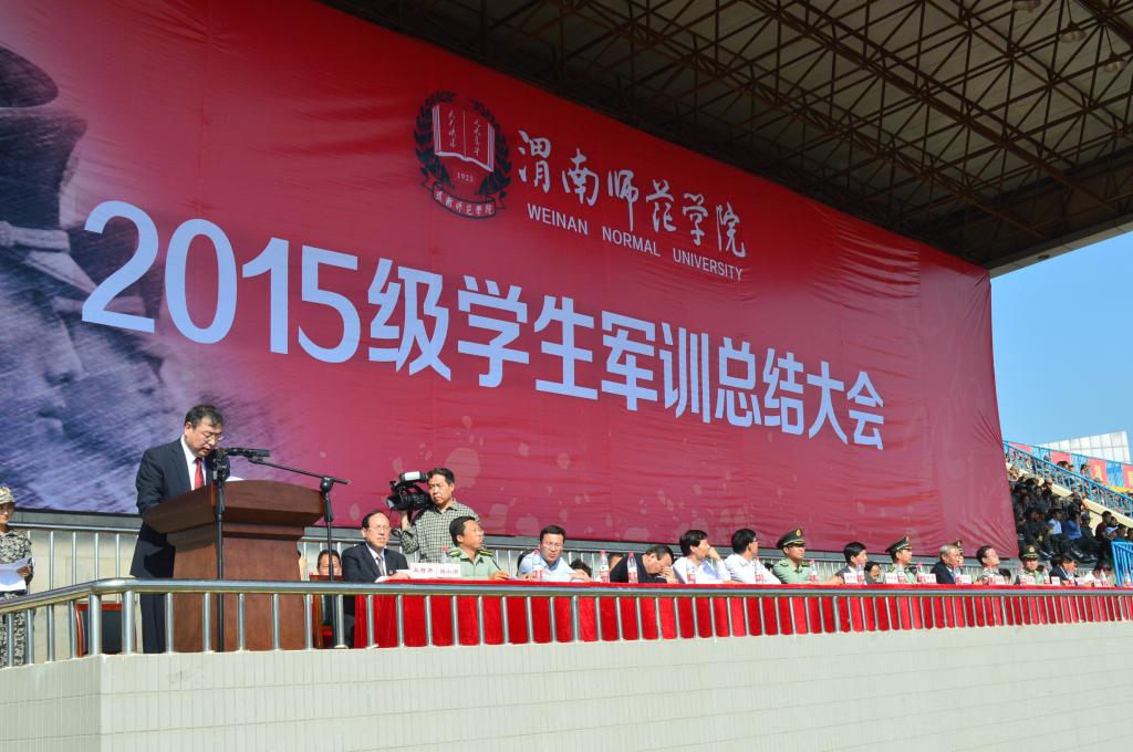 9月23日上午,bat365官网2015级学生军训总结大会在朝阳校区田径场召开。63788部队站长王栋,临渭区武装部政委王忠文,63788部队政治处主任李建辉,2015级学生军训团团长霍伟华,学校党委书记张金安,副院长王君龙,纪委书记任健,副院长程书强、李海龙,国防教育领导小组成员,各二级学院领导以及2015级全体新生参加军训总结大会。大会由党委委员、国防教育领导小组副组长杨小渭主持。