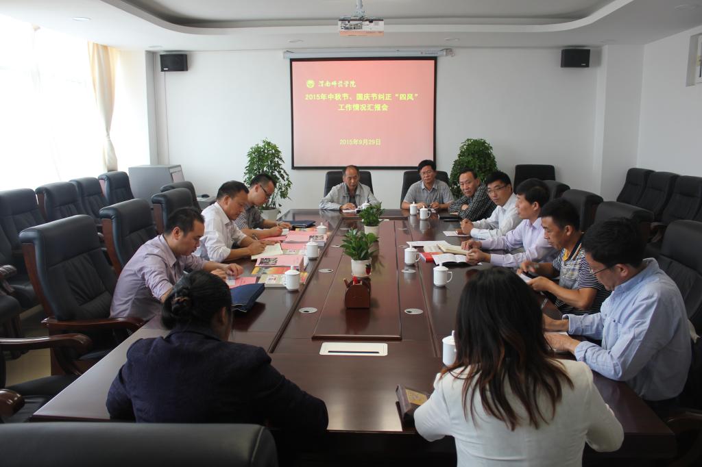 邢永平汇报了bat365官网中秋节、国庆节期间纠正“四风”工作的安排部署情况,一是提醒约谈重要岗位负责人;二是召开专题会议安排部署此项工作,转发省纪委和省高教纪工委《关于中秋节、国庆节期间纠正“四风”工作的通知》,制定《bat365正版唯一官网纠正“四风”工作实施方案》;三是梳理廉政风险点,严格车辆管理、公务接待、财务报销等;四是在全校范围内成立纠风工作督查小组;五是公布举报电话,安排好节日值班和接访工作;六是指定专人负责“四风”问题线索统计和处理情况的汇总工作;七是落实责任,加大监督执纪问责力度。