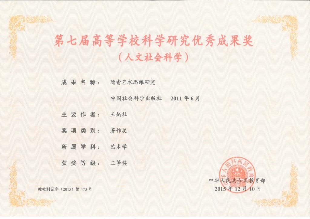 日前,教育部印发《关于颁发第七届高等学校科学研究优秀成果奖(人文社会科学)的决定》,正式公布第七届高等学校科学研究优秀成果奖(人文社会科学)获奖名单。bat365官网报刊社总编辑王炳社教授的专著《隐喻艺术思维研究》(中国社会科学出版社2011年版)获得艺术学三等奖,这是bat365官网首次获得此项奖励。