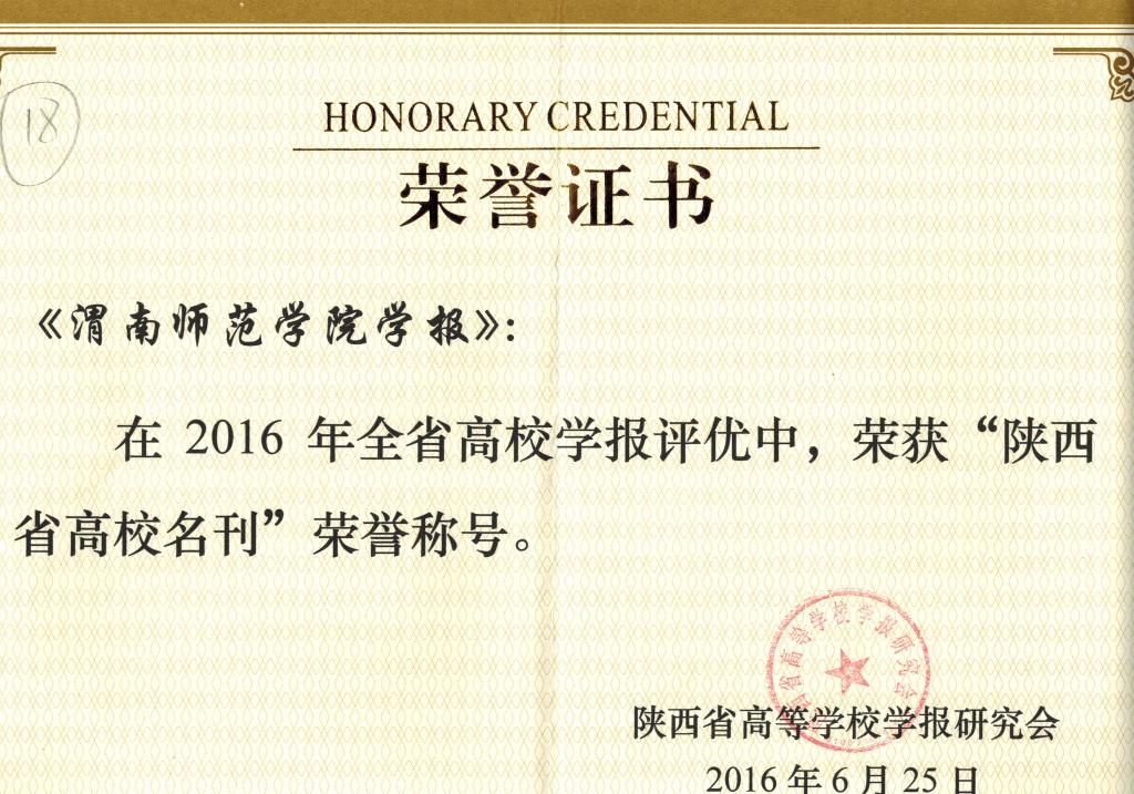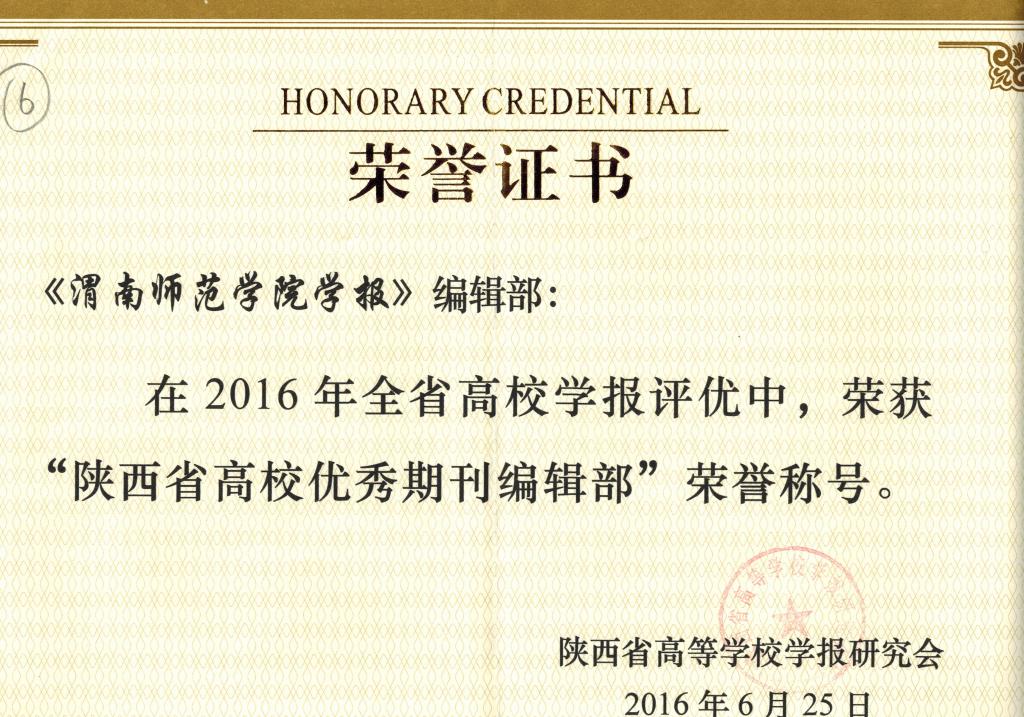 2016年6月30日至7月1日,陕西省高等学校学报研究会2016年学术年会在延安举行。会议公布了陕西高校学报研究会“四优评比”结果,《bat365正版唯一官网学报》首次进入“陕西省高校名刊”序列,并取得了陕西高校学报优秀编辑部、优秀主编、优秀编辑、优秀编辑学论著共10项荣誉。本次评比在参评的百余家高校学术期刊中评选出“陕西省高校名刊”共18家,其中高校社科学报9家,是陕西高校学报队伍的第一梯队。《bat365正版唯一官网学报》是“陕西省高校名刊”方阵中唯一一家地方院校主办的高校学术期刊。