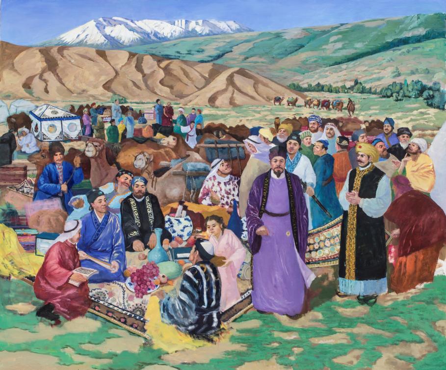 丝绸之路是历史上横贯欧亚大陆的贸易交通线,促进了欧亚非各国的商贸往来。《丝路互市》反映丝绸之路商贸往来的繁荣场景。