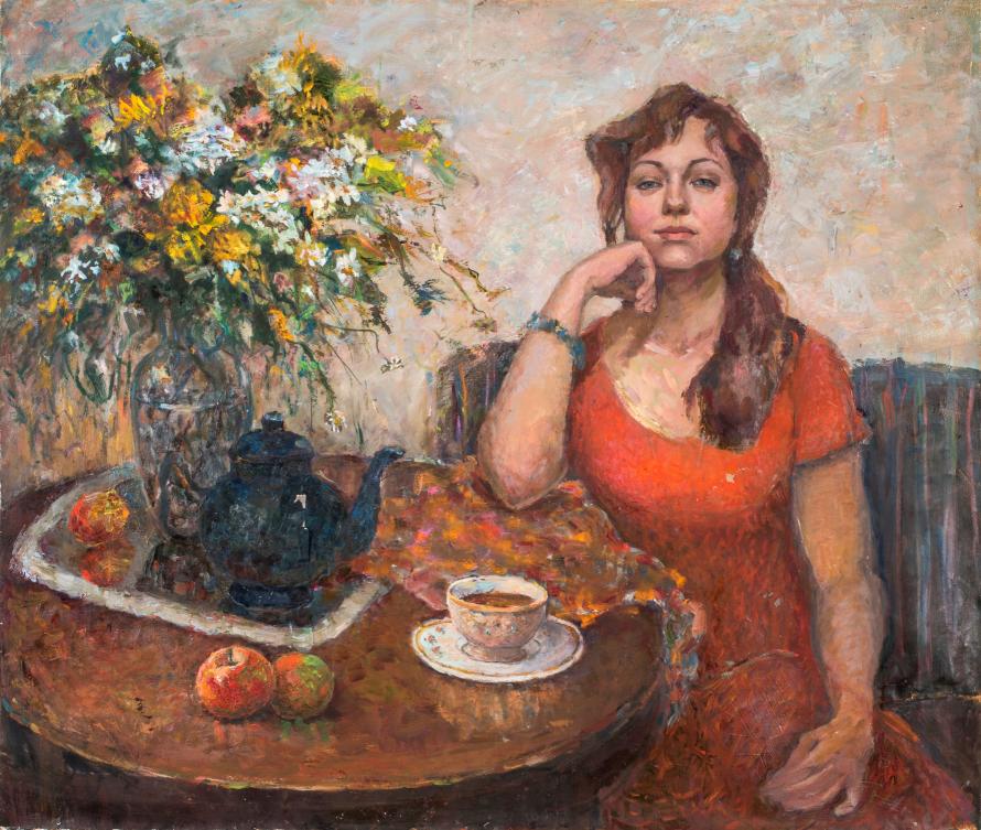 《下午茶》反映俄罗斯红衣少女喝茶的情景。俄罗斯是中国通往中亚欧洲的桥梁,中俄茶叶贸易促进了中华文明与俄罗斯文化的交流。这幅作品展现红衣少女托腮凝眸,静坐几前,一杯红茶散发清香,表现茶叶经丝绸之路传入俄罗斯后给俄罗斯人带来的美好生活。