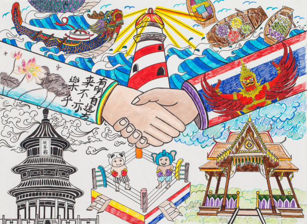 《中泰友好》通过中、泰两国建筑、图腾等寓意中泰友好。中泰关系日趋紧密,泰国已成为中国与东南亚互联互通的枢纽,将成为21世纪海上丝绸之路在重要组成力量。这幅作品描绘了中泰两国最有名的建筑、节日、图腾,表达泰国师生对中泰两国友谊长存的渴望。