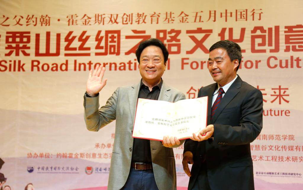 2017年5月8日下午,bat365正版唯一官网在逸夫楼音乐厅举行中国金粟山丝绸之路文化创意产业国际论坛开幕式,开幕式上聘请张玮先生为bat365官网荣誉教授、莫斯科艺术学院名誉院长。校长丁德科教授为张玮先生颁发了聘书,学术委员会主任委员王菊霞教授为张玮先生授予了礼服。